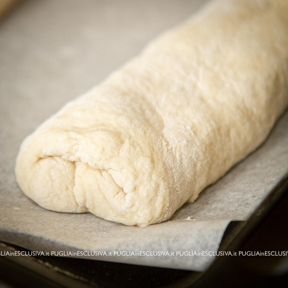 Schiaccia la pasta in modo da formare una fascia larga e lunga, rigira i lati piΓΉ lunghi verso il centro della fascia di impasto (vedi foto);