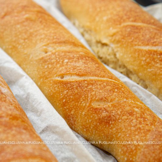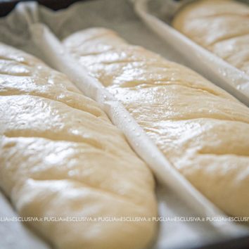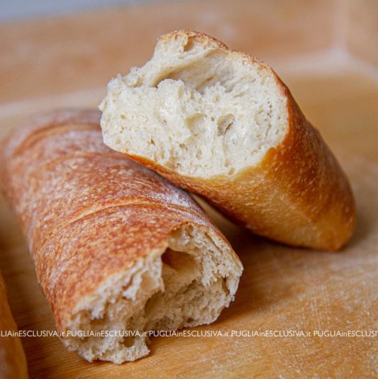 Prepara anche tu il buon pane fatto in casa, la ricetta della baguette facile e veloce da realizzare, con un impasto lento e a lunga lievitazione che garantisce una elevata sofficitΓ . Ottime da farcire con prodotti tipici pugliesi o per realizzare croccanti bruschette condite con aglio e pomodoro. Non dimentichiamo la classica “scarpetta”, tipica della nostra Puglia. L’uso di soli 6 grammi di lievito di birra, inoltre, consente di effettuare una lievitazione lentissima di almeno 24 ore in modo da ottenere un impasto estremamente soffice. La dose del lievito di birra diventa di 12 grammi se si vuol preparare la baguette dopo soli 4-6 ore di lievitazione.