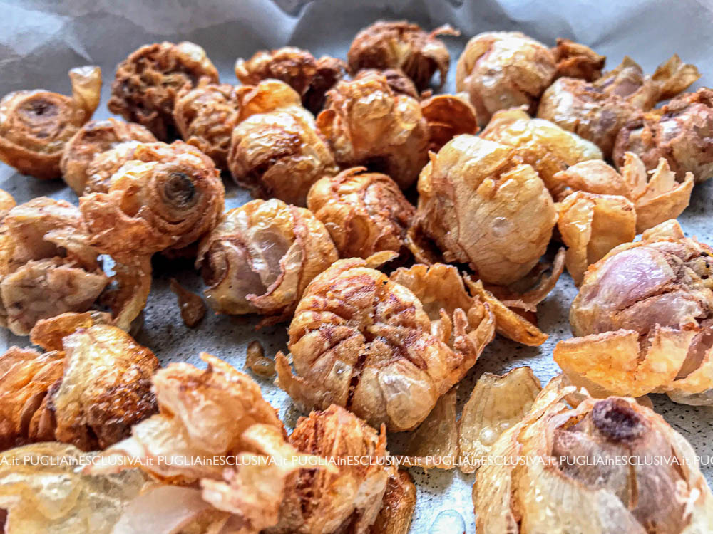 I lampascioni, sono dei bulbi che crescono sotto terra dalla forma simile a una piccola cipolla e dal sapore amarognolo, molto ghiotto in Puglia. I lampascioni hanno bisogno di molti anni per crescere a una profonditΓ  di circa 20 cm sotto terra, possono essere lessati e assaporati semplicemente con olio e pepe, oppure i lamponi possono essere gustati fritti.