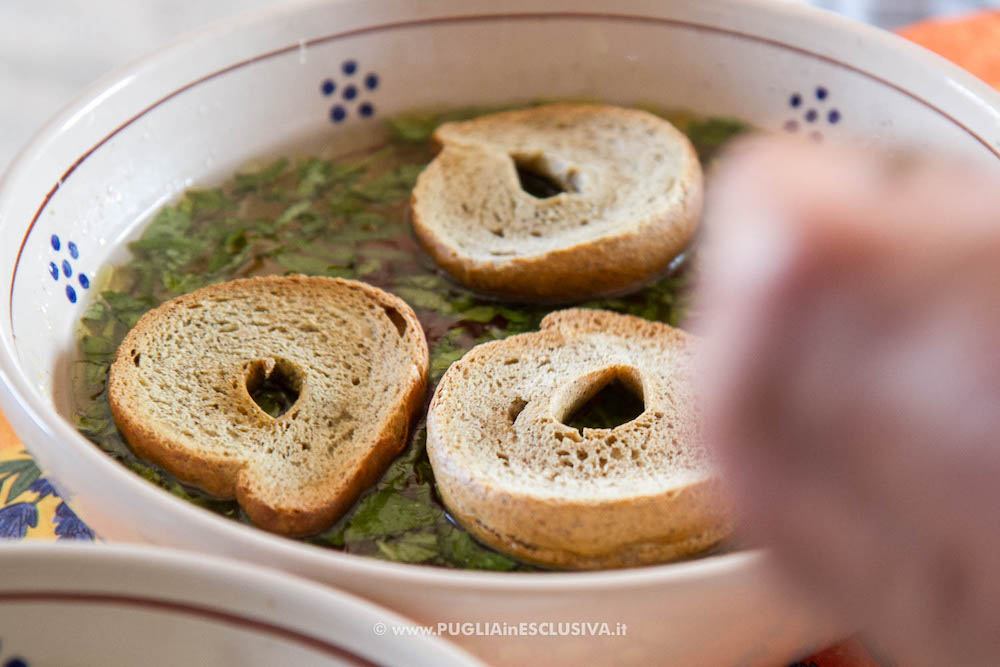 Aggiungi all’interno dell’acqua aromatizzata le friselle, in modo da farle ammorbidire lievemente e allo stesso tempo insaporire con gli aromi contenuti. Attenzione al tempo di ammollamento delle frise, vanno reidratate con acqua acidulata per mantenere una consistenza piΓΉ compatta;